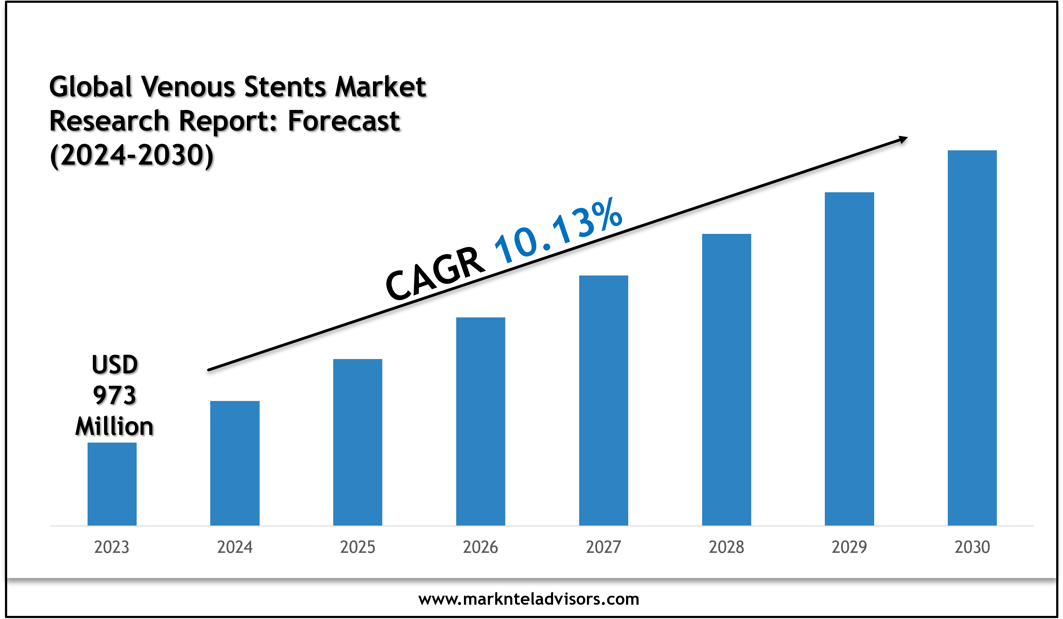 The Global Venous Stents Market size is valued at around USD 973 million in 2023 and is estimated to grow at a CAGR of about 10.13% during the forecast period, i.e., 2024-30. The market has witnessed impressive growth in recent years, and several key factors contribute to this demand. Firstly, there has been a notable increase in the prevalence of venous disease cases. For instance, according to the Centers for Disease Control and Prevention (CDC), around 900,000 individuals are affected each year in the United States, from which around 60,000-100,000 die due to venous thromboembolism.