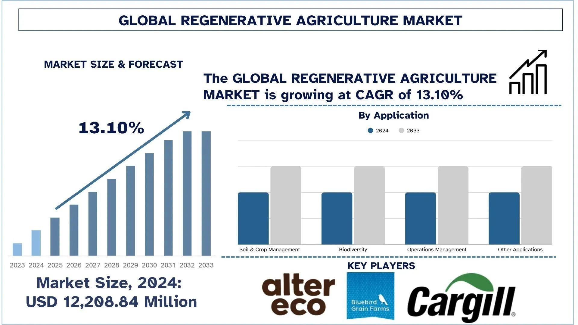 According to the UnivDatos, as per their “Regenerative Agriculture Market” report, the global market was valued at USD 12,208.84 million in 2024, growing at a CAGR of about 13.10% during the forecast period from 2025 - 2033 to reach USD million by 2033.