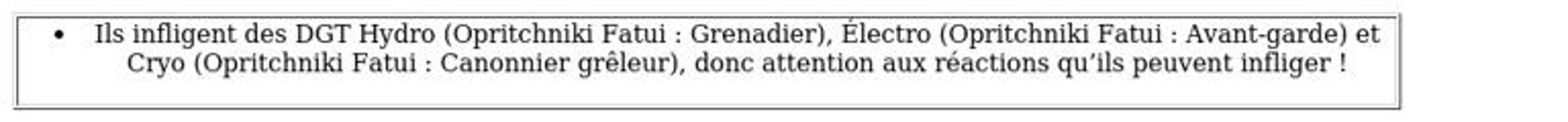 • L’Opritchniki Fatui, qu’il s’agisse de la troupier de ligne ou de la Gvardiya Foudroyante, ne possède aucune résistance spécifique, mais est également sensible à tous les éléments.