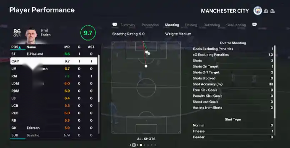 Player performance metrics are tracked in detail, including goals, assists, total shots, and shot accuracy percentage.