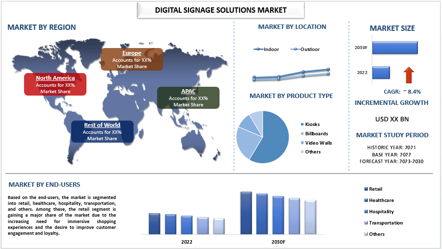 As businesses focus on providing an exceptional customer experience, the demand for digital signage solutions will only continue to grow. Whether it’s for retail, education, healthcare, or any other industry, digital signage solutions are poised to revolutionize the way we communicate and engage with one another. The future of digital signage solutions looks bright, and we can expect to see new and innovative products and services emerge as the market continues to evolve. According to the UnivDatos analysis, “Digital Signage Solutions Market” report, the global market was valued at USD 24.9 Billion in 2022, growing at a CAGR of 8.4% during the forecast period from 2023 – 2030 to reach USD billion by 2030.