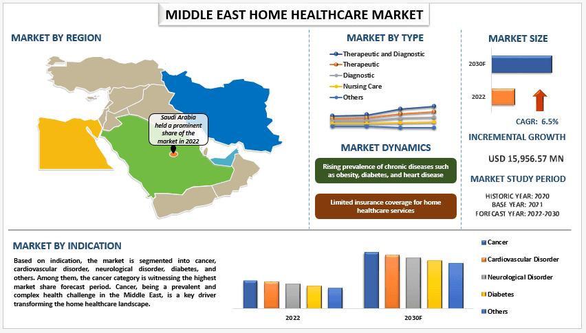 According to the UnivDatos analysis, the growing chronic cases in the region will drive the scenario of home healthcare and as per their “Middle East Home Healthcare Market” report, the middle east market was valued at USD 15,956.57 million in 2022, growing at a CAGR of 6.5% during the forecast period from 2023 – 2030 to reach USD million by 2030.