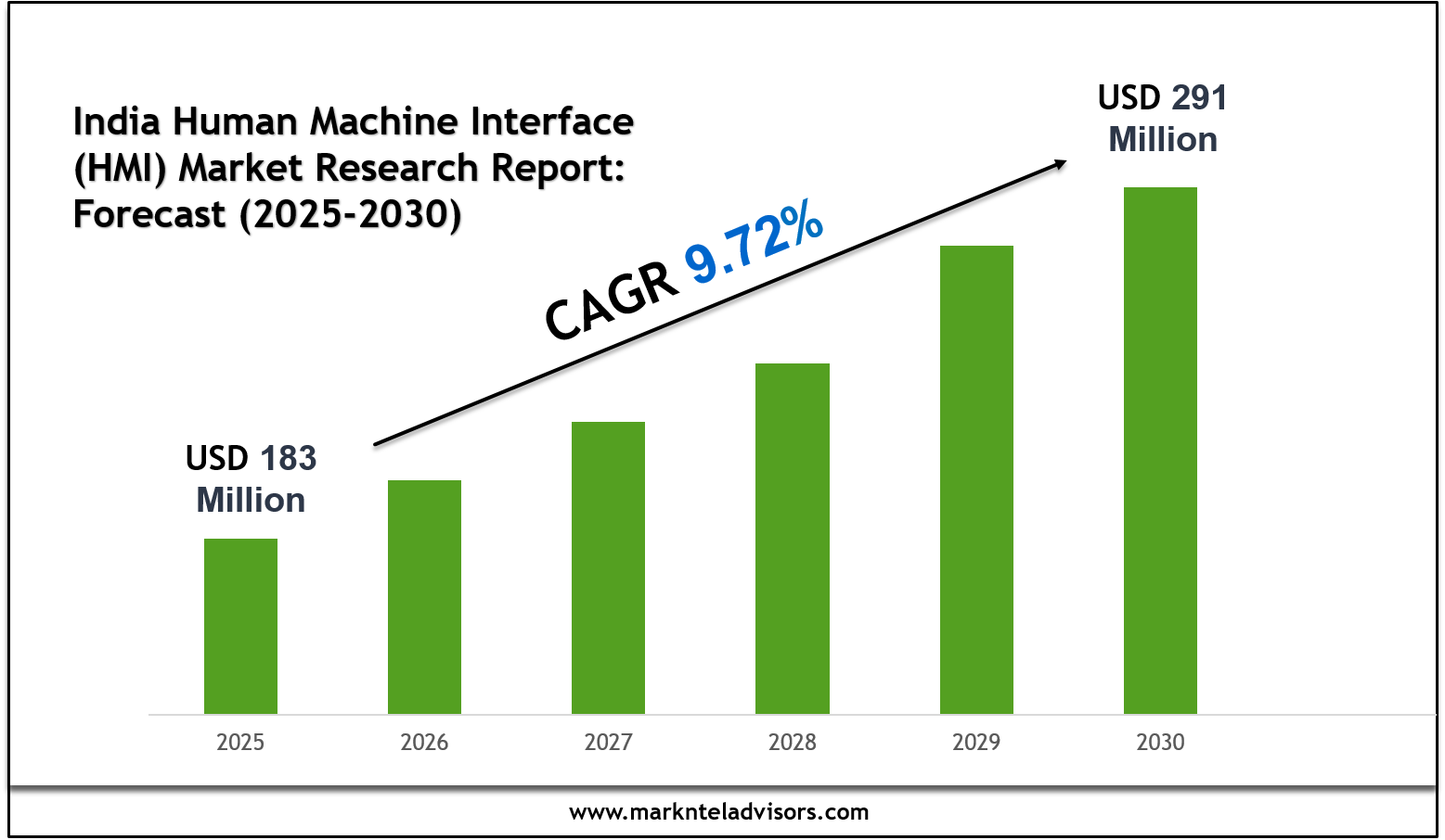The India Human Machine Interface (HMI) Market size is valued at around USD 183 million in 2025 and is expected to reach USD 291 million by 2030. Along with this, the market is estimated to grow at a CAGR of around 9.72% during the forecast period, i.e., 2025-30.